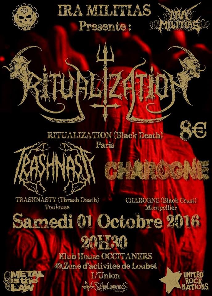 Pour vous mettre en forme, l' association IRA MILITIAS vous propose un programme chargé de poésie, mélodie et douceur de vivre. Le samedi 01 Octobre 2016 vous pourrez donc offrir à vos oreilles à 20h30 un peu de : - RITUALIZATION ( black/ death - Paris ) https://www.facebook.com/Ritualization-145905645471417/?fref=ts - TRASHNASTY ( brutal death - Carmaux ) https://www.facebook.com/Trashnasty-158297897561441/?fref=ts - CHAROGNE ( black crust - Montpellier ) http://charognecrust.bandcamp.com/releases
