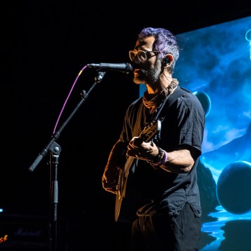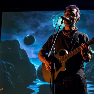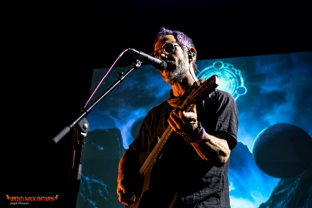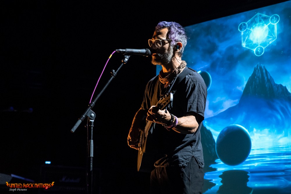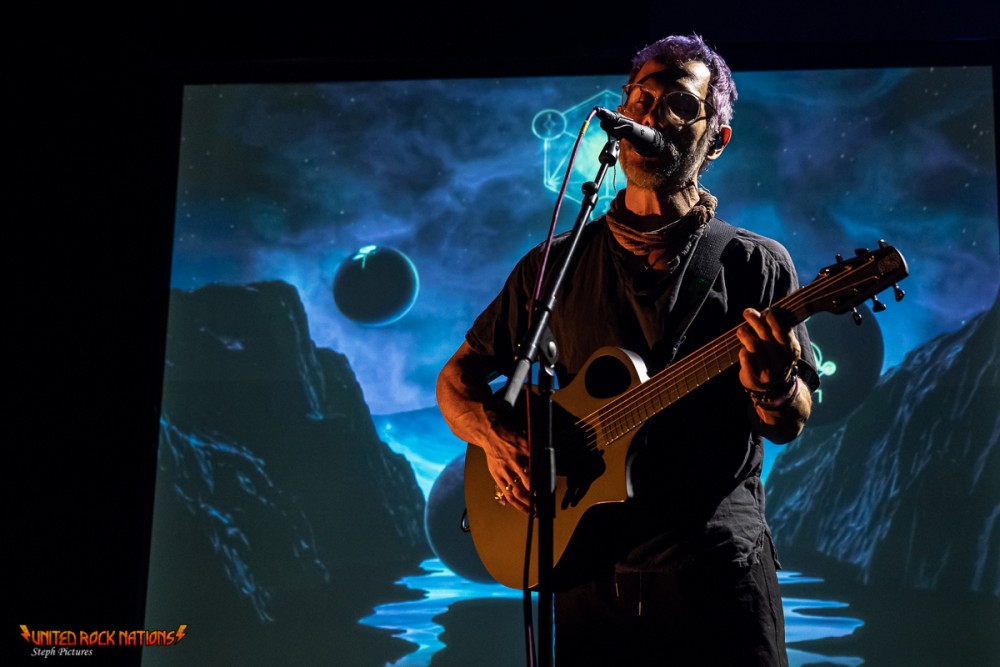 C'est donc muni de sa guitare et de son micro que Paul MASVIDAL se positionne devant nous avec son ordi posé au le sol sur son coté droit, et oui il faut bien gérer la bande son comme on peut quand on est tout seul. Derrière lui se trouve un écran géant ou seront diffusées des images représentants soit des planètes soit des formes plus ou moins psychédéliques qui évoluent au cours du titre joué.