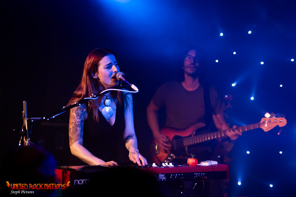 Aussitôt dit, aussitôt fait, c’est avec ‘Pain’ que se poursuit la soirée. Les fans ont le plaisir de retrouver la voix de la chanteuse qui n’a pas l’air d’être trop fatiguée par la tournée qui s’achève avec cette date parisienne. Pour occuper l’espace, et permettre à Anna Murphy d’avoir facilement accès à tous ses instruments, c’est le guitariste Ivo Henzi qui est au centre de la scène. Le bassiste se retrouve donc à l’arrière où il est malheureusement à moitié invisible. La batterie de Merlin Sutter est, en revanche, très bien placée, ce qui mérite d’être souligné puisqu’il est assez rare de pouvoir vraiment observer le jeu d’un batteur ! ‘Insomnia’, et son apogée pleine de tension, résonne ensuite, accompagnée d’un light show épileptique. Avant ‘Death’, la chanteuse glisse deux mots : « How did you like I Am The Morning? We’re so happy it worked out for this tour, it feels like a family tour. And today is the last day of the tour so we think about doing it again, how would you like that? » Vous vous doutez bien que le public ne se fait pas prier pour montrer son approbation.