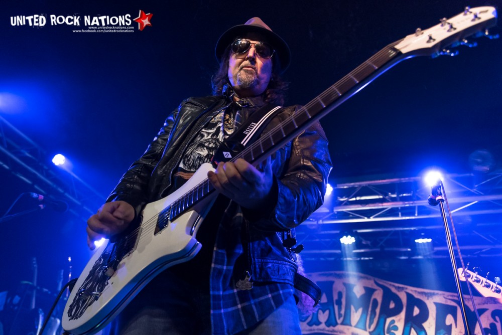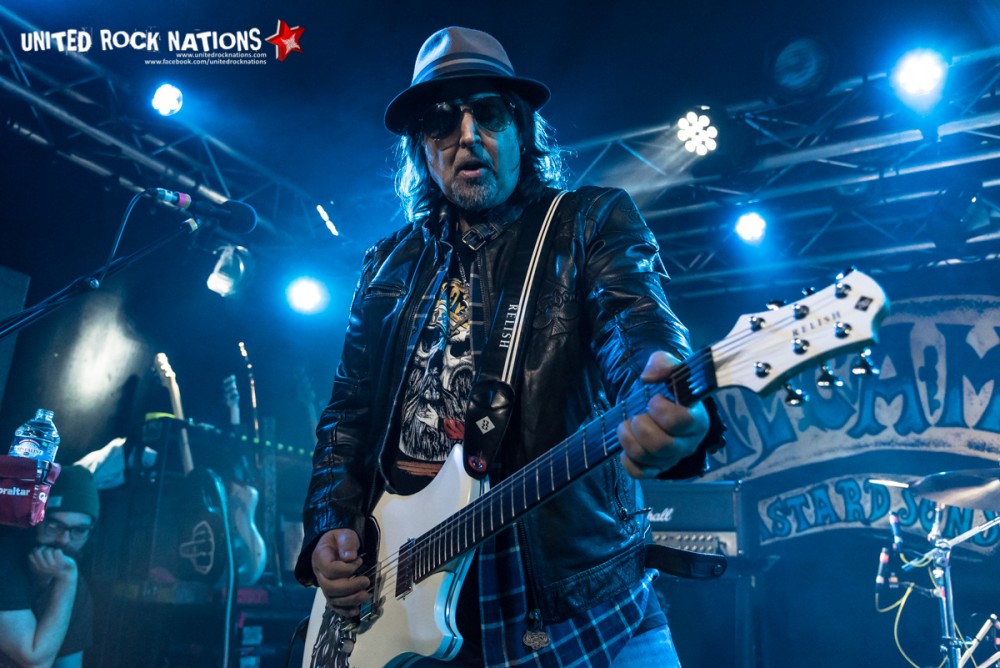 Quoiqu'il en soit le moment que tous les fans de Motörhead, et pas que, attendent est enfin arrivé avec la montée sur les planches de La Boule Noire de Phil Campbell et de ses bastard Sons. Il ne sera pas nécessaire au groupe de produire le moindre son pour que le public exprime son plaisir de voir Phil Campbell devant lui et autant vous dire que l'ombre et l'esprit de Lemmy a alors immédiatement recouvert la salle et tous ses occupants. Phil Campbell, ex guitariste du mythique groupe Motörhead qui a nourri de son talent des générations de metalleux et qui continu à le faire car Motörhead désormais classé au rang de légende continue de couler dans le biberon des futures générations de chevelus rebelles. Phil Campbell and the Bastard Sons quant à lui est un groupe de Rock'n'roll tout jeune qui a vu la sortie le 26 janvier dernier de son premier album « The Age of Absurdity » le groupe ayant également sorti un EP en 2016 intitulé tout simplement « Phil Campbell and the Bastard Sons ». Et bien le groupe va justement lancer les hostilités avec le premier titre de cet EP à savoir « Big Mouth » qui sera l'étincelle qui mettra le feu aux poudres et déclencher des mouvements de corps plus ou moins contrôlés. Dès les premières notes on s'envole vers d'autres lieux. Neil Starr (chant) est tout bonnement survolté, on a l'impression qu'il lui faudrait une scène dix fois plus grande tellement il donne l'impression de se retenir, pour soulager son trop plein d'énergie il enchaine les petits sauts furieux et envoie ses cervicales au diable à l'aide de violents coups de tête d'avant en arrière que l'on ne peut pas cataloguer dans la catégorie des headbangs. Todd (guitare) et Tyla (guitare basse) ne sont pas en reste en braillant autant que possible tout en envoyant des riffs et des rythmiques qui nous donnent envie d'imiter Neil. A la batterie Dane tabasse ses fûts comme un damné, moi je ne voudrai pas être à la place de ses tom.