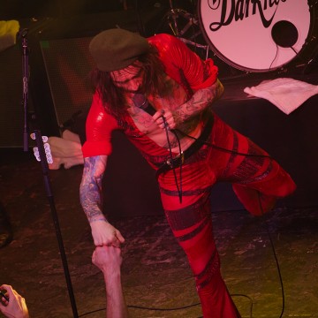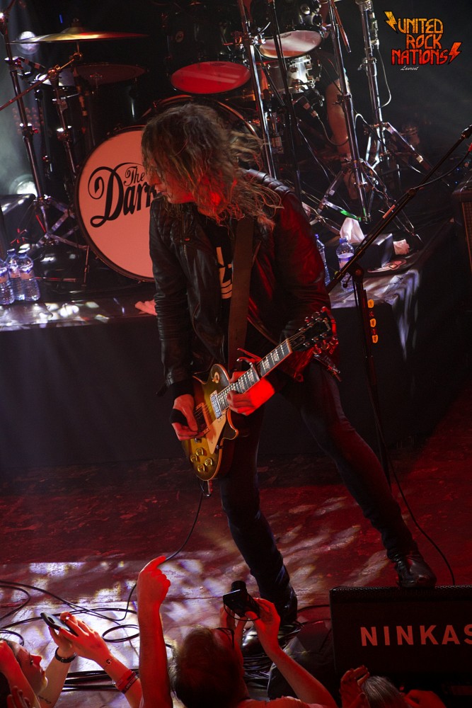 Entracte. Oui, on peut parler d’entracte car il se passe 2/3 minutes avant que le groupe n’effectue son retour sur scène. Le bassiste Frankie POULLAIN revient avec une tenue de scène typée seventies, pattes d’eph et veste improbable ( ah ces British et leur humour si particulier) muni d’une cloche et d’une baguette pour annoncer la suite du show. Et là on ne rigole plus. Dan HAWKINS, frère de, revient tout de noir vêtu, blouson de cuir et tee-shirt Thin Lizzy. Justin, quant à lui a opté pour du sobre. Non, je rigole. Une combinaison rouge vif avec empiècements à paillettes. Le terme glam rock prend tout son sens. Les guitares ont agressives et les tubes s’enchaînent. Le public est déchaîné. Justin fait évidemment le show, pique le béret d’un spectateur et se le colle sur la tête le temps d’une chanson, il fait chanter le public, interagit avec lui de manière spontanée et les sourires illuminent les visages. Justin nous gratifie d’un magnifique poirier sur l’estrade de la batterie. Le show se termine par la chanson que tout le monde attend ( et qui les a fait découvrir par le public) : " I believe in a Thing Called Love". C’est la folie dans la fosse et Justin finit par se jeter dans la fosse pour être transporté par la foule. Oui, c’est bien de l’amour qu’il s’agit entre le groupe et son public.