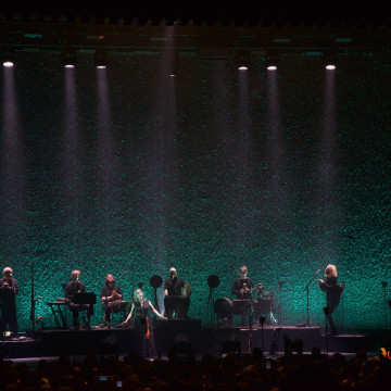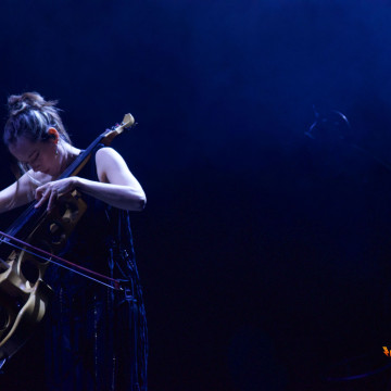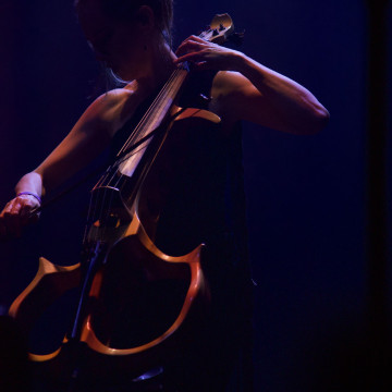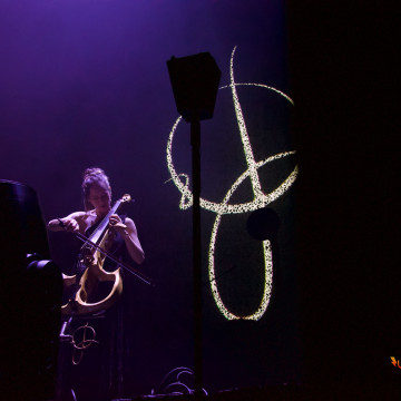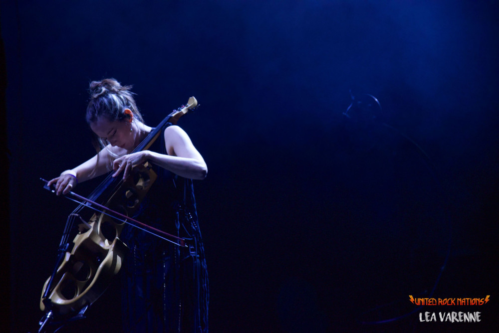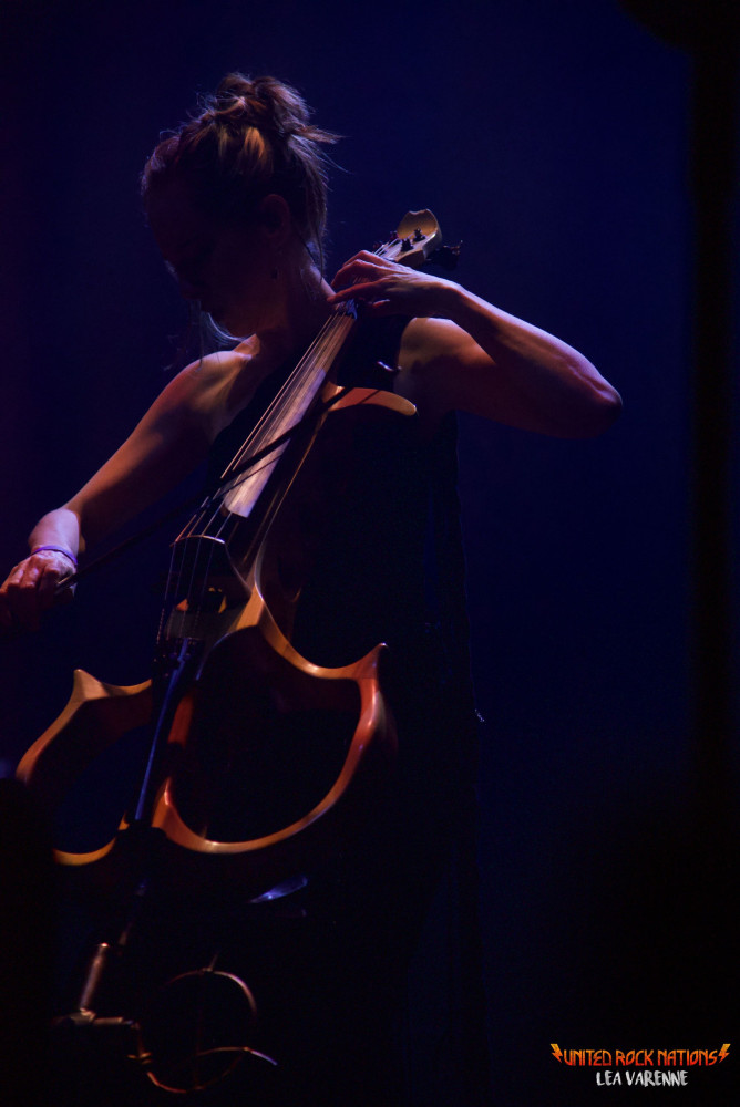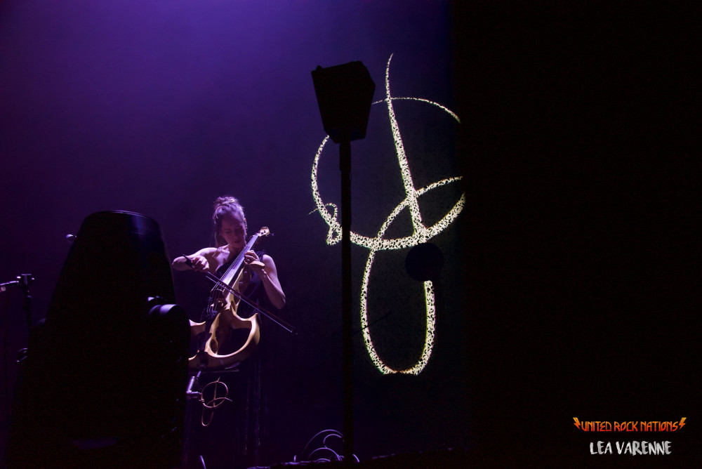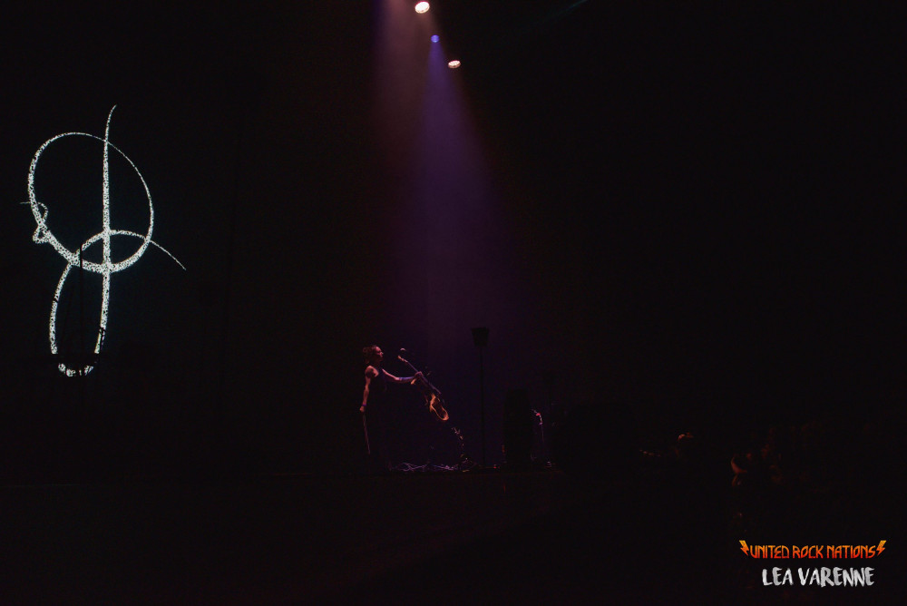 Elle entre en scène pour la première partie. Avec son grand sourire, elle nous salue, en nous précisant bien que ce sera le seul mot français qu’elle pourra prononcer. Elle ne jouera que trois morceaux, avec pour unique compagnon son violoncelle. Après le premier morceau doux qui nous plonge dans une ambiance apaisée, elle nous fait cadeau du second morceau (« I offer you this song ») ; celui-ci sera pour guérir (« for healing »). À la fin du morceau, elle entre dans une petite leçon d’accordage en nous expliquant qu’il est en Ad et Charp B et que le troisième sera en GDGD, pour les initiés…Ce troisième et dernier morceau, il s’agit de son hymne à l’énergie de la mer (« hymn to the energy of the sea »). Elle nous explique s’être inspirée de la mer qui vient s’écraser contre les falaises pour composer. Les couleurs sur scène nous plongent dans une ambiance maritime et nous entraîne dans les flots tumultueux qui résonnent dans les sonorités qu’elle emploie, les sons qui l’accompagnent. Puis, souriante, son violoncelle à la main, elle quitte la scène.