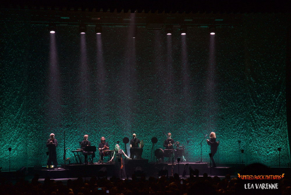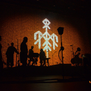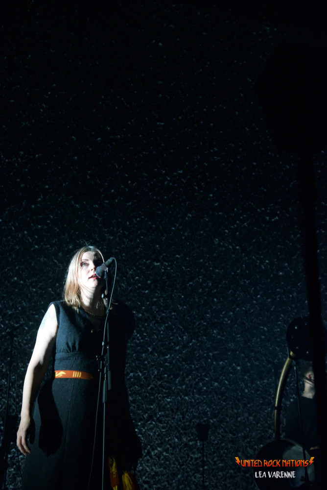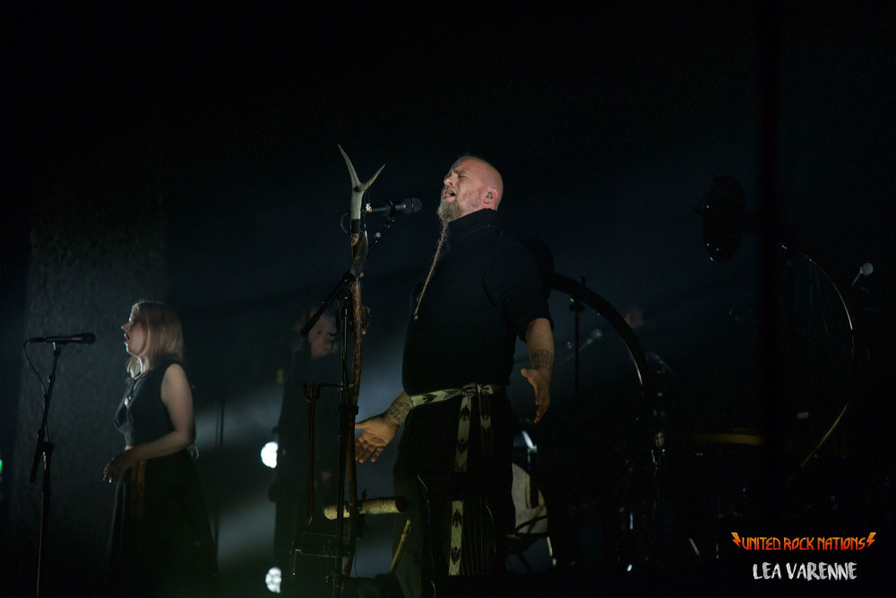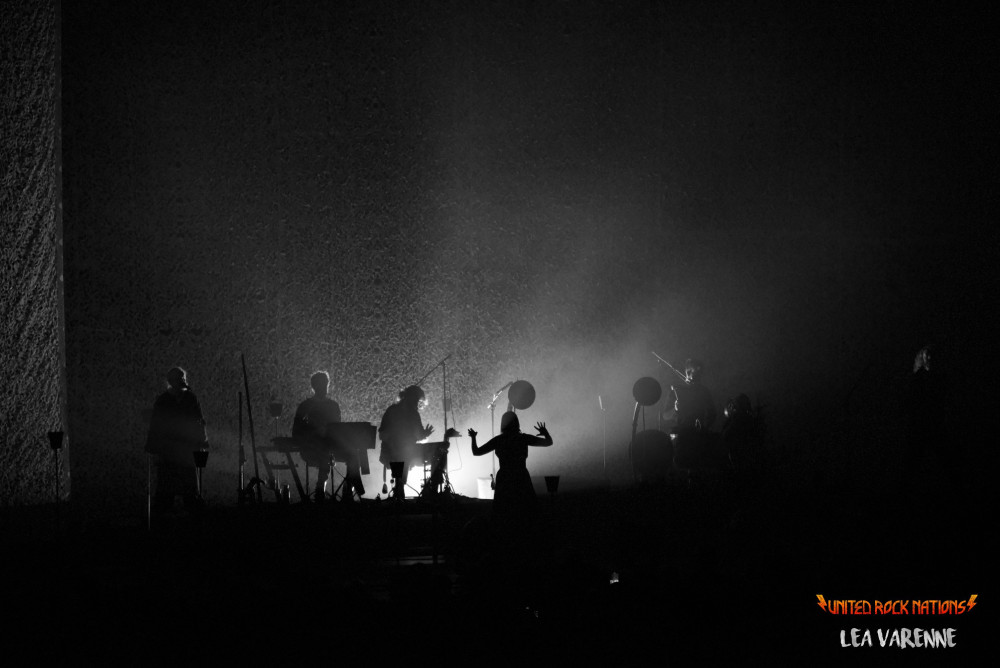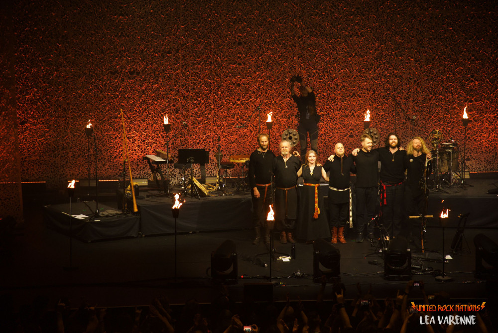 Sur fond orange dégradé, les 6 musiciens entrent sur scène tels des ombres, si bien que l’on croit voir apparaître devant nous des silhouettes de peintures rupestres. Pas un mot prononcé, un simple bonsoir et ils commencent leur set pour un public attentif et silencieux. J’apprécie l’ambiance de la salle, qui, plongée dans un autre temps, dans une autre dimension accompagnée de sonorités nordiques et viking, semble avoir été transportée tout droit en Norvège 900 ans auparavant.