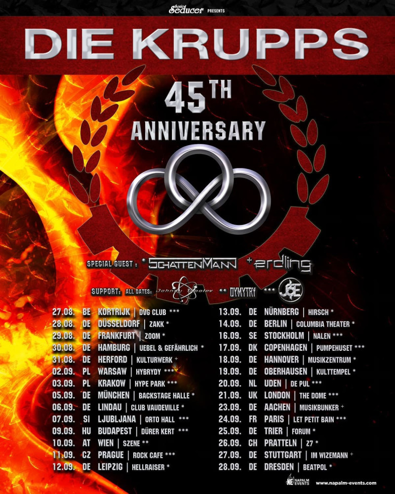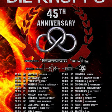 Fondé à Düsseldorf en 1980 par Jürgen Engler et Ralf Dörper, DIE KRUPPS a marqué l'histoire de la musique en pionnier des genres Industrial, EBM (influencent FRONT 242 et NITZER EBB) et Industrial Metal (influencent RAMMSTEIN). Le nom du groupe, inspiré par l'aciérie Krupp, symbolise la fusion de la machine et de la musique. Aujourd'hui, le line-up inclut Engler, Dörper, le batteur Paul Keller et le guitariste Dylan Smith, anciennement de THE SISTERS OF MERCY, apportant une nouvelle dynamique au son déjà puissant du groupe.