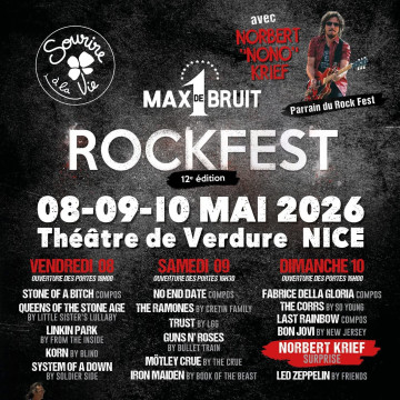 Préparez-vous à faire trembler les murs du Théâtre de Verdure ! L’association "1 Max De Bruit", en partenariat avec la Ville de Nice, revient avec la 12e édition de son festival rock caritatif. L'objectif est clair : offrir un maximum d'énergie au profit des enfants hospitalisés et de l'association "Sourire à la Vie". Toujours le parrainage de la légende de la guitare Norbert "Nono" Krief, ces trois jours promettent une immersion totale dans l’histoire du rock.